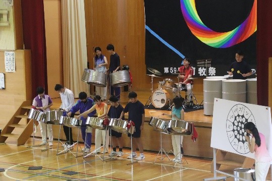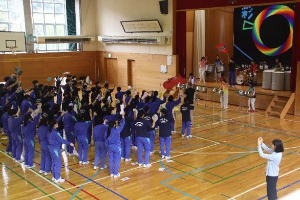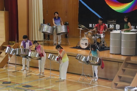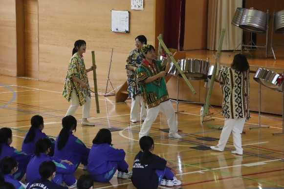 スティールパンオーケストラ「PAN NOTE MAGIC」の皆さんによる演奏を楽しみました。演奏を聴くだけでなく、クラスの代表者による実演やタオルなどを振って演奏者と一緒に楽しむ企画もありました。