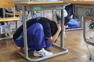 今回は、時間予告なしの避難訓練を行いました。昼休みでしたが、事前に確認したシェイクアウト(その時にいる場所でとっさに身を守る)訓練がしっかりできていました。また放送機器が使用できないという想定でしたが、その場の状況や先生方の声をたよりに自ら判断し、行動に移すことができました。
